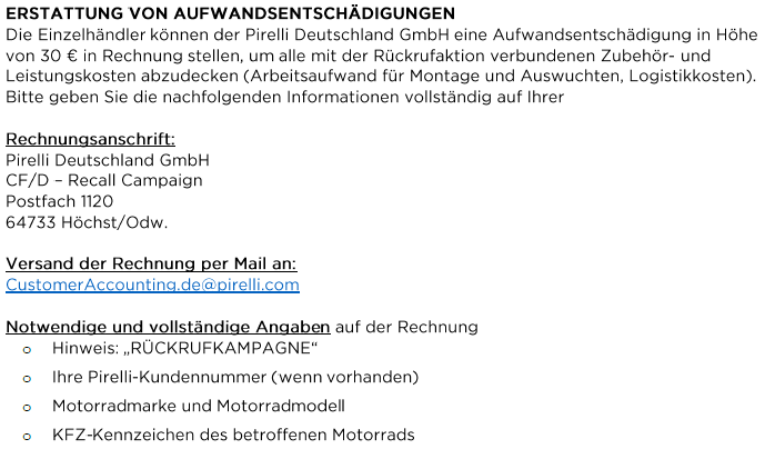 - Händler meldet sich Contact Center - 01802309111 oder per Mail an market.quality@pirelli.com und informiert, dass er einen vom Rückruf betroffenen Reifen ersetzten lassen möchte.